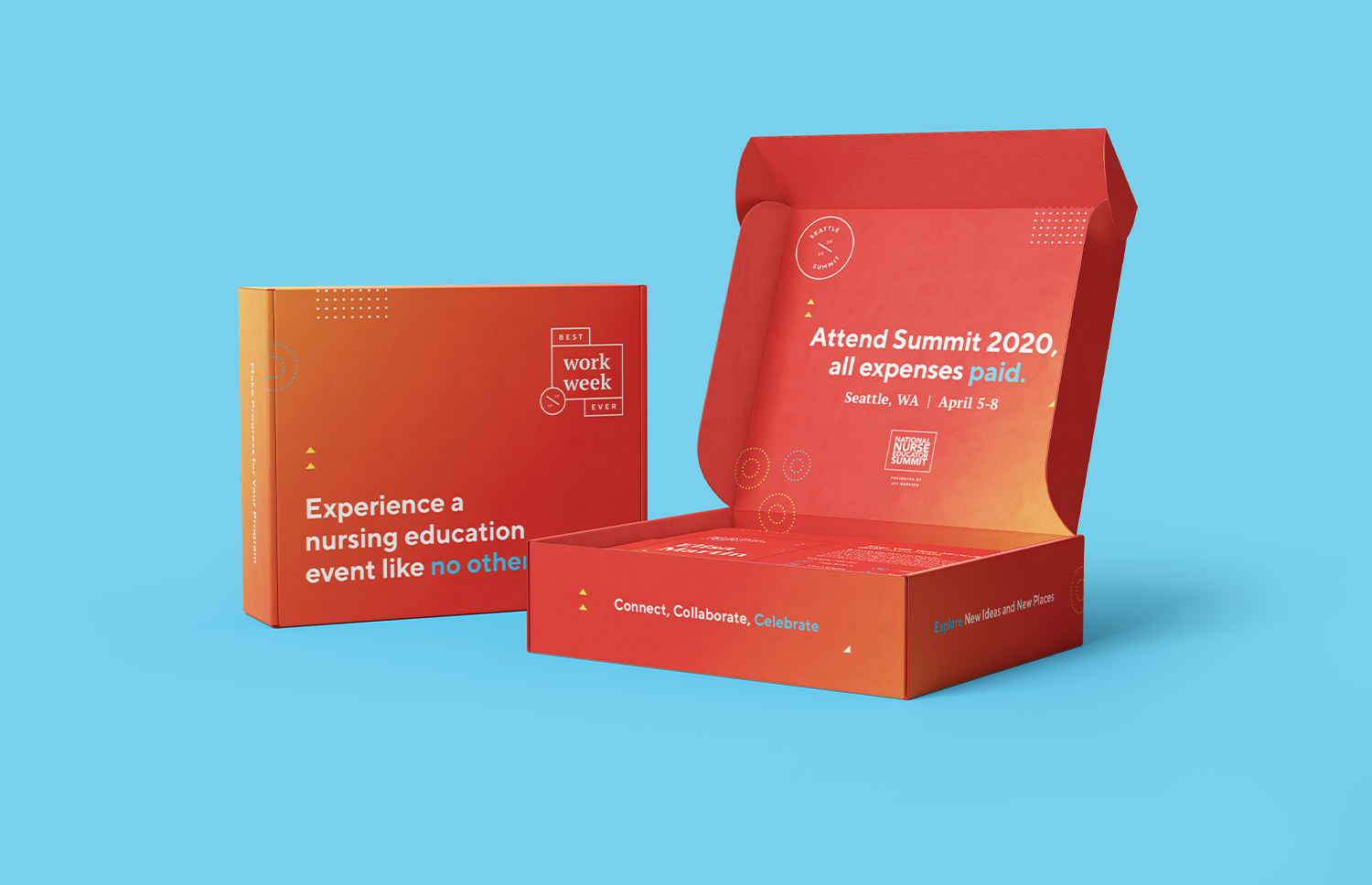 ATI hosts an annual summit for nurse educators across the country. Coined yearly as the “Best Workweek Ever,” the chosen destination for 2020 was Seattle, Washington. This tech-forward city exudes innovation, nicely complementing ATI’s exciting advancements for the next generation of nurses. Through vibrant visuals, modern graphic elements, and headway-making headlines, we set out to empower educators to confidently take on this new age of nursing.